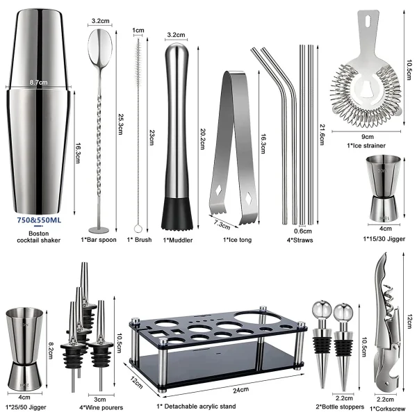 - 【20Pcs Cocktail Making Set】Cocktail shaker set includes: 1*550ML&750ml Boston shaker, 2* jigger(50ml/25ml; 30ml/15ml), 4 * wine pourers, 2 * straight straw, 2 * bend straw, 1*ice strainer, 1*Ice Tongs,1*brush,1*Muddlers,2*wine stoppers,1*Waiter’s corkscrew,1*bar spoon, 1* recipe and 1*Acrylic Set rack. 550ml&750ml large-capacity Boston shaker can produce more bubbles, and make the wine more perfect in taste and appearance, giving you more bartending options.